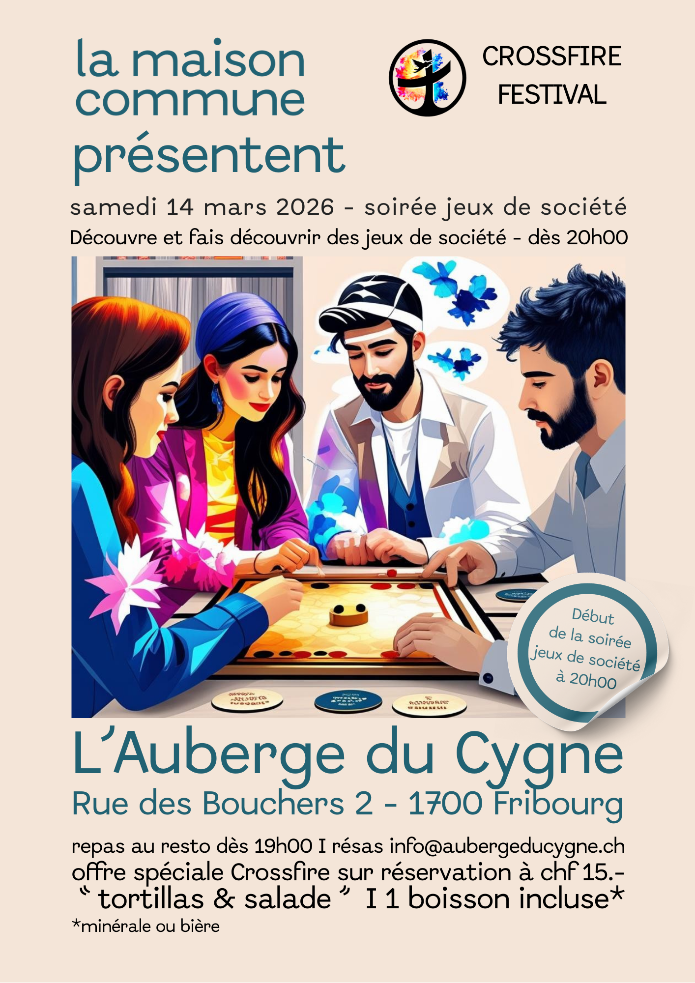 Le Crossfire Festival passe un samedi du côté de l'Auberge du Cygne pour vous proposer un moment de détente, de 7 à 77 ans, et découvrir des jeux de société. Viens avec tes ami.e.s et si tu le veux, prends un jeu avec toi à faire découvrir à d'autres dès 20h00. Le bar est ouvert et tu peux y rencontrer des personnes passionnées par la foi et les relations amicales.