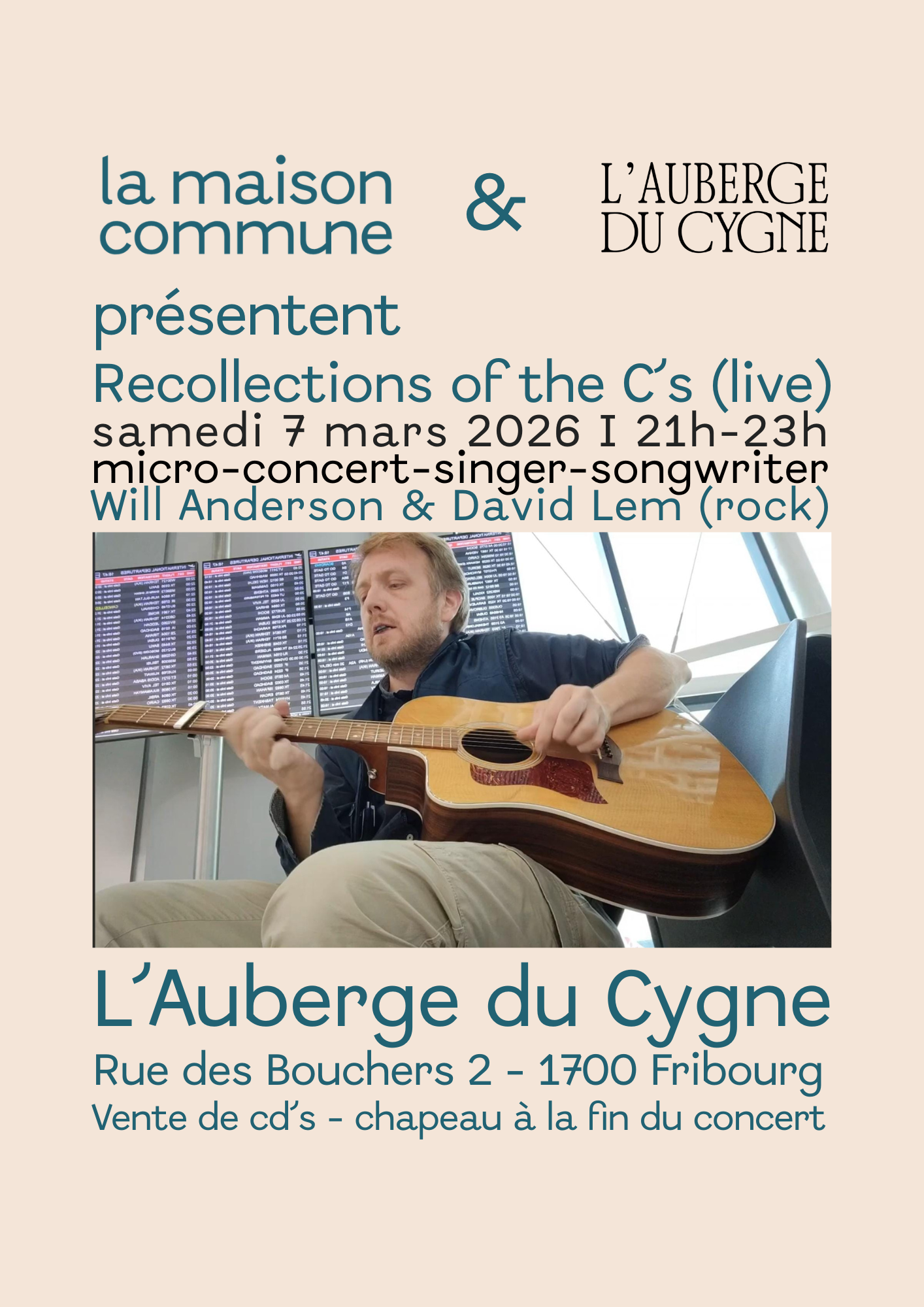 L’album “Recollections of the C’s” régroupe les vagues d'adrénaline, de la peur, de la satisfaction et du voyage sur une mer de gitarres et harmonies vocales, voyagé en 2021…2025, enrégistré en 2025, performé devant vous. Samedi le 07.03.2026 c’est le lancement de ses “Recollections of the C’s” à Fribourg à l’Auberge de Cygne.